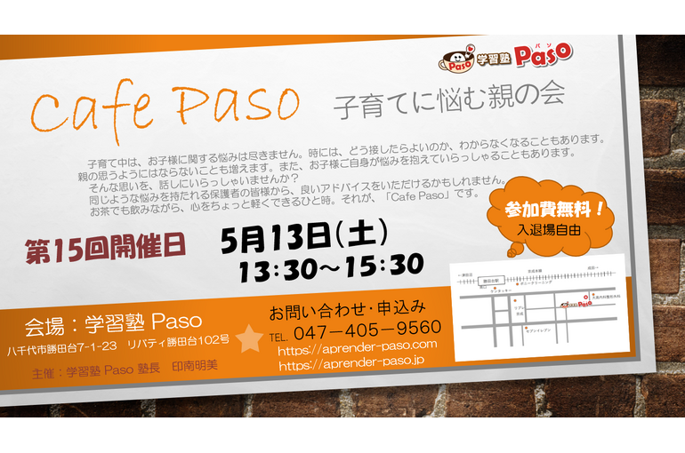 第15回 Cafe Paso 開催します♪ 2023/05/10 進学、進級をされてから約一か月。 お子様のご様子はいかがでしょうか。 せっかく身についた新学期のリズムが、GWを経て乱れてしまったということはないですか? ・新年度を迎えたお子様のご様子 ・昨年度の入試結果報告 ・中3生の修学旅行と定期テストに向けての学習の両立 など、いつものようにまったりとお話しできればと思っております。 直前まで申し込み可能です。 お問い合わせ、お待ちしております。 新着情報