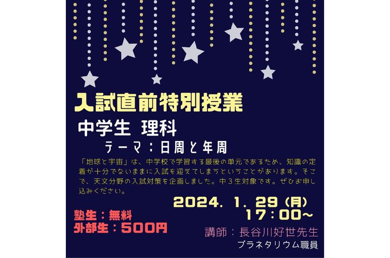 特別授業の変更について 2024/01/16 先日お知らせしました「入試直前特別授業」ですが、 講師の先生のご都合で、「29日(月)」に変更となりました。 時間は同じです。 ぜひ、ご参加ください! 新着情報