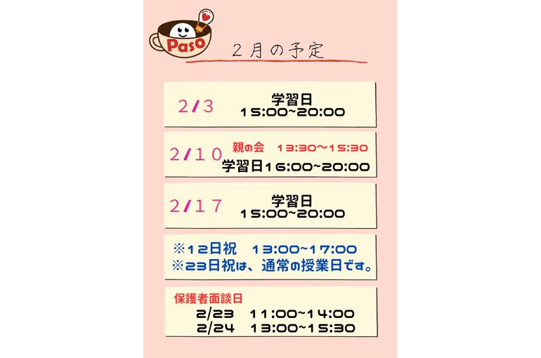 2月の予定 2024/01/29 2月の予定をご確認ください。10日(土)「Cafe Paso 親の会」13:30~ 12日(祝)時間変更しています。23日(祝)通常授業(お休みの場合、事前にご連絡ください。2月23,24日,3月2日は、学年末面談日です。どうぞよろしくお願いいたします。 新着情報