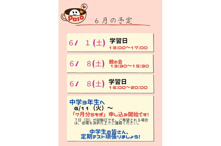 6月の予定 2024/05/29 中学生は、定期テスト前学習に入りました。 体育祭、修学旅行もあり、子どもたちは忙しい日々です。 新学期が始まったかと思えば、はや6月。 定期テストが終わるまで、 土曜日は学習日です。 時間をうまく遣って、中身の濃い学習をさせていきたいです! 新着情報