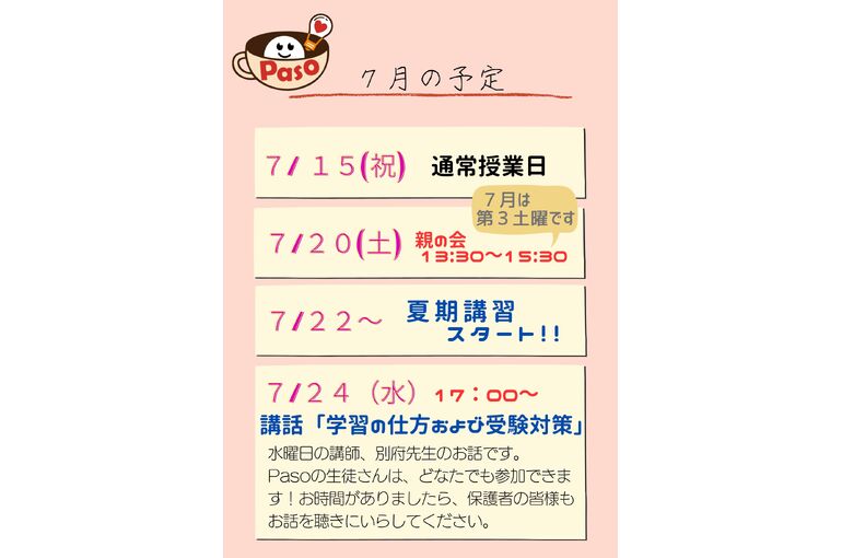 7月の予定 2024/06/28 7月の予定です。 ご確認ください。 Pasoの夏期講習は、イベント盛りだくさんです! どうぞお気軽にお問い合わせください! 夏休みまで、あと3週間! 実は、この時期の学習が大事です! 新着情報