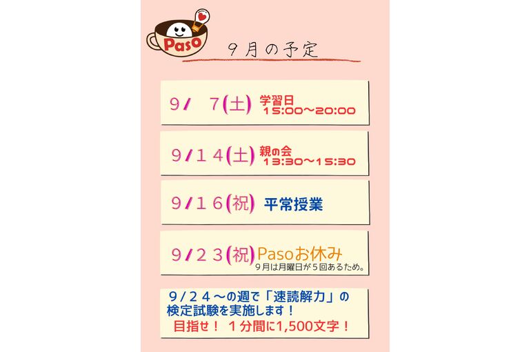 9月の予定 2024/08/28 夏休みも、あと4日となりました。 Pasoの皆さんは宿題は終えているので、 定期テストに向けての学習、および入試対策に力を入れています。 「9月の予定」をご確認ください。 新着情報