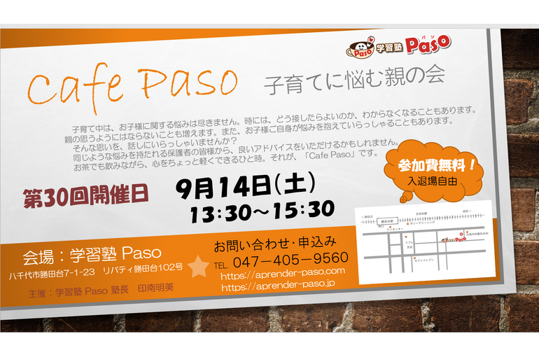 9月の親の会「Cafe Paso」 2024/09/03 9月の親の会は、通常通り第2土曜日に開催いたします。 夏休み中、夏休み明けのお子様のご様子はいかがでしょうか? 行事の多い秋、通知表をいただく秋。 気持ちに波が生じやすいこの期間の、 お子様のサポートの仕方などを、皆さんでお話ししませんか。 どなたでもご参加いただけますので、 どうぞお気軽にお問い合わせください。 9月14日(土) 13:30~ 新着情報