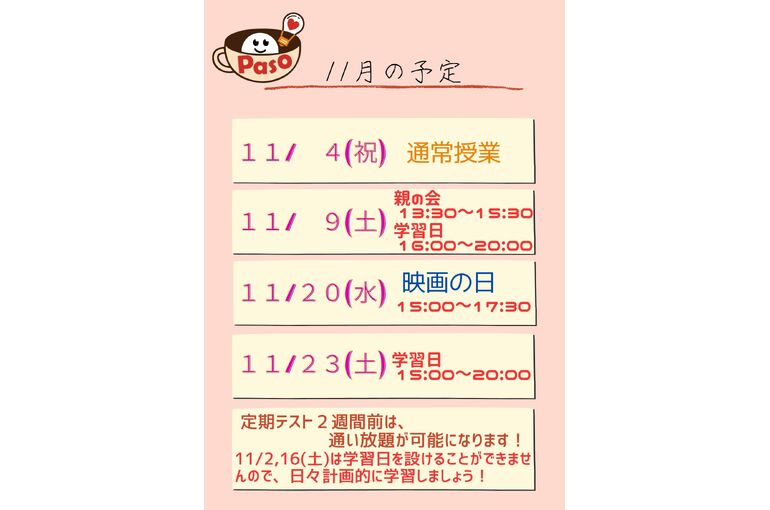11月の予定 2024/10/29 Pasoには12校の中学校から生徒さんが通ってくださっています。 そのため、定期テストの日程も様々で、 11月中、ずっとテスト期間です。 通知表の反省を生かして、頑張っていただきたいです! 11月の予定です。 ん? 映画の日? と、お気づきになられた方は、お気軽にお問い合わせください。 新着情報