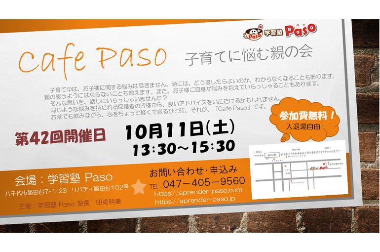 10月の親の会「Cafe Paso」 2025/10/07 「Cafe Paso」親の会は、市民活動団体に登録しております。 その関係で、今年度は『市民活動フェスティバル』に参加することになりました。 ステージでの演奏参加です。 勝田台文化センターにて 演奏時間:13:30~14:00 入場無料ですので、お気軽にお越しください。 今月の親の会は、 11日(土) 13:30~ となります。 こちらでもお待ちしております 新着情報