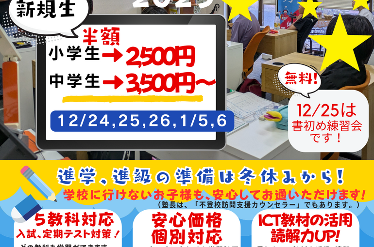 冬期講習2025 2025/11/25 「冬期講習」のお知らせです! 今年度は5日間です。 24日クリスマスイブは13時から「映画会」を開催します。 クリスマスにふさわしい映画を検討中です。 25日(木)は10時から「書初め練習会」を行います。 新規生は破格です! 近隣の小学生、中学生の皆様、お待ちしております。 お気軽にお問い合わせください。 新着情報