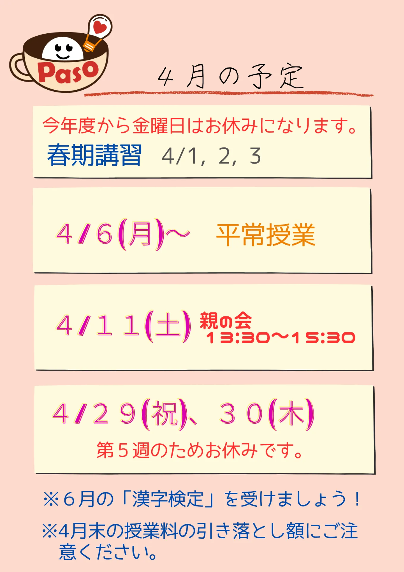 4月の予定 2026/04/03 令和8年度がスタートしました。 3月30日~4月3日までの春期講習も無事に終了しました。 4月の予定をご確認ください。 今年度も、どうぞよろしくお願いいたします。 新着情報